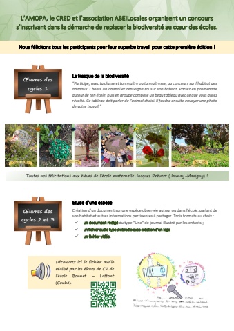 L%u2019AMOPA, le CRED et l%u2019association ABEILocales organisent un concours s%u2019inscrivant dans la d%u00e9marche de replacer la biodiversit%u00e9 au c%u0153ur des %u00e9coles. Nous f%u00e9licitons tous les participants pour leur superbe travail pour cette premi%u00e8re %u00e9dition ! La fresque de la biodiversit%u00e9 \animaux. Choisis un animal et renseigne-toi sur son habitat. Partez en promenade autour de ton %u00e9cole, puis en groupe compose un beau tableau avec ce que vous aurez r%u00e9colt%u00e9. Ce tableau doit parler de l%u2019animal choisi. Il faudra ensuite envoyer une photo de votre travail.\Toutes nos f%u00e9licitations aux %u00e9l%u00e8ves de l%u2019%u00e9cole maternelle Jacques Pr%u00e9vert (Jaunay-Marigny) ! Etude d%u2019une esp%u00e8ce Cr%u00e9ation d%u2019un document sur une esp%u00e8ce observ%u00e9e autour ou dans l%u2019%u00e9cole, parlant de son habitat et autres informations pertinentes %u00e0 partager. Trois formats au choix : %uf0fc un document r%u00e9dig%u00e9 du type \%uf0fc un fichier audio type webradio avec cr%u00e9ation d%u2019un logo%uf0fc un fichier vid%u00e9o. D%u00e9couvrez ici le fichier audio r%u00e9alis%u00e9 par les %u00e9l%u00e8ves de CP de l%u2019%u00e9cole Bonnet %u2013 Laffont (Couh%u00e9). %u0152uvres des cycles 1 %u0152uvres des cycles 2 et 3