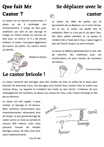 Le castor est un %u00e9ternel constructeur, ilpasse sa vie %u00e0 am%u00e9nager sonenvironnement. Il coupe du bois pouram%u00e9liorer son abri et son barrage etmange en m%u00eame temps les %u00e9corces dubois pour se nourrir. Si il a de jeunesenfants, le castor s%u2019occupera %u00e9galementde nourrir ses petits. Les castors viventen famille...Mathis et KylianQue fait MrCastor ?Se d%u00e9placer avec lecastorLe castor est d%u00f4t%u00e9 de pattes, qui luipermettent de se d%u00e9placer sur la terre ferme.Sur le sol, le castor est plut%u00f4t lent etmaladroit. Mais ce n%u2019est pas le cas dans l%u2019eau.Ses deux pattes palm%u00e9es et sa queue lerendent tr%u00e8s %u00e0 l%u2019aise dans l%u2019eau, il peut nager %u00e0pr%u00e8s de 7km/h lorsqu%u2019il se sent menac%u00e9.Le castor se d%u00e9place g%u00e9n%u00e9ralement la nuit, afinde chercher des mat%u00e9riaux pour sesconstructions, ou pour trouver de nouveauxterritoires.Emma et JulesLe castor bricole !Le castor construit des barrages avec des rondins de bois et utilise de la boue pourboucher les %u00e9ventuels trous. Ces barrages ainsi form%u00e9s font monter l%u2019eau et cr%u00e9ent uner%u00e9serve d%u2019eau, sur laquelle ils installent leur hutte ou leur terrier. L%u2019int%u00e9rieur de leuram%u00e9nagement est maintenu au dessus du niveau de l%u2019eau, mais l%u2019acc%u00e8s immerg%u00e9 se faitpar en dessous.Le castor est tr%u00e8s rapide, il peutmonter un barrage en 24 heures.Mais certaines constructions plusimpressionnantes n%u00e9cessitent plusde temps. Le plus grand barrage decastor connu se situe au Canada etmesure 850 m%u00e8tres, mais nouspouvons trouver de simplesbarrages autour de chez nous toutaussi impressionnants.Lou et L%u00e9a